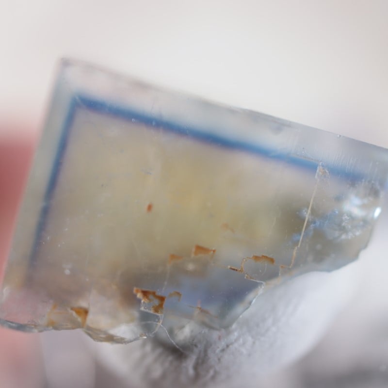 透明感のあるイエローとくっきりとしたブルーのラインが特徴的な美しい結晶です。