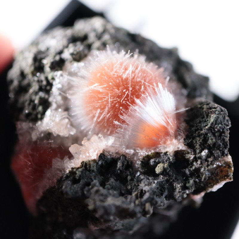 オレンジ色の中心部からふさふさと生えている細く白い結晶が素敵なコントラストです。
